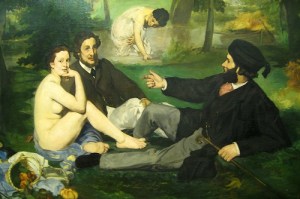 Stepping back from the constant exhortations to “eat organic” or grow my own tomatoes or feel guilty about the plight of chickens and cows (and believe me, I do feel very badly about the factory mentality that allows all of us to buy meat at much reduced prices), I take refuge in my kitchen, my cookbooks, and my “foodie” books by writers like M. F. K. Fisher, Elizabeth David (much maligned in certain circles), and Roy Andries de Groot. In other words, books that extol food memories as portrayed in Éduard Manet’s Déjeuner sur l’Herbe. (I try not to think of the one flaw — the naked woman and the undeniable insect population that usually attends picnics in swarms … .)