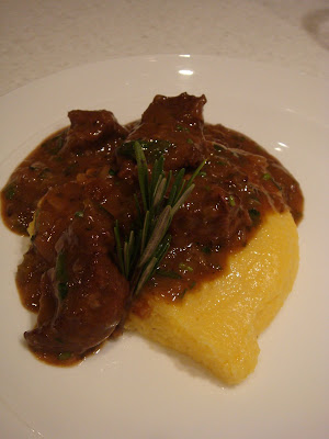 Preheat the oven to 350 degrees F. Brown the beef in a large heavy-bottomed pot, in the olive oil heated over medium-high heat. You may have to brown the meat in batches. Be sure to get the meat to an almost caramel color. Stir in the garlic and rosemary. Cook for about 1 more minute. Add the wine and deglaze the pot. When wine has reduced by half, add the crushed tomatoes and the sugar. Bring to a boil, remove from heat, and place pot in preheated oven. Cook for 3 hours or until meat is very tender. Serve over polenta or with mashed potatoes.
