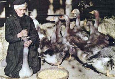 Today’s forcefeeders are mostly women and those I have observed at work in France have always been gentle people, many chatting to the birds and stroking their back plumage. The birds, contrary to what one might imagine, always seem eager to receive their patée of corn kernels, pork fat, and salted water and push at one another for access to the feeder and to their water trough. (p. 899, The New Making of a Cook)