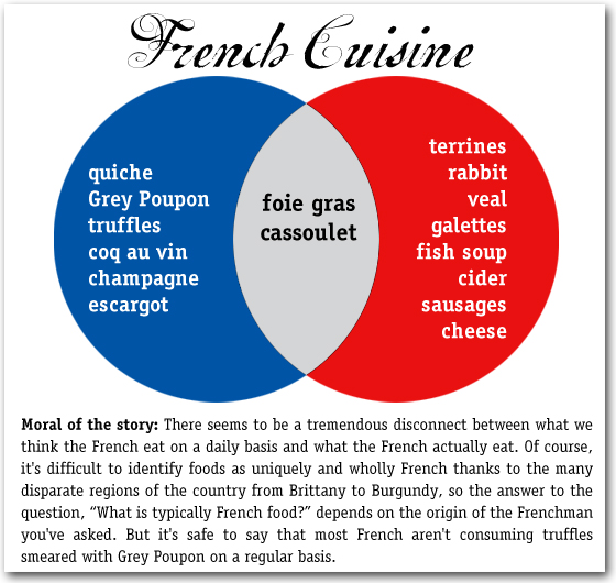 The left side of the diagram shows what foods Texans associate with French eating habits, the right side shows what French people think about their own eating habits, and the center shows foods common to both groups’ perceptions.