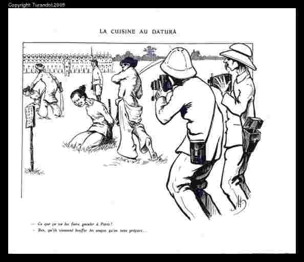 Particulars: Based on pictures taken during the execution of culprits of a poisoning effort, August 8, 1908 in Tonkin. The caption alludes to the narcotic (datura) that Vietnamese cooks added to French troops’ soup. The drug was supposed to weaken them, but not kill them.