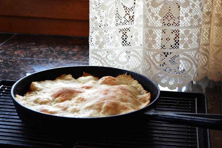 Remove the skillet from the oven and place on cooling rack for a few minutes, not longer. (If you don’t think the caramel is cooked enough, set the skillet oven a burner on medium-high and let the caramel bubble a little bit, watching it constantly to avoid last-minute burning, )