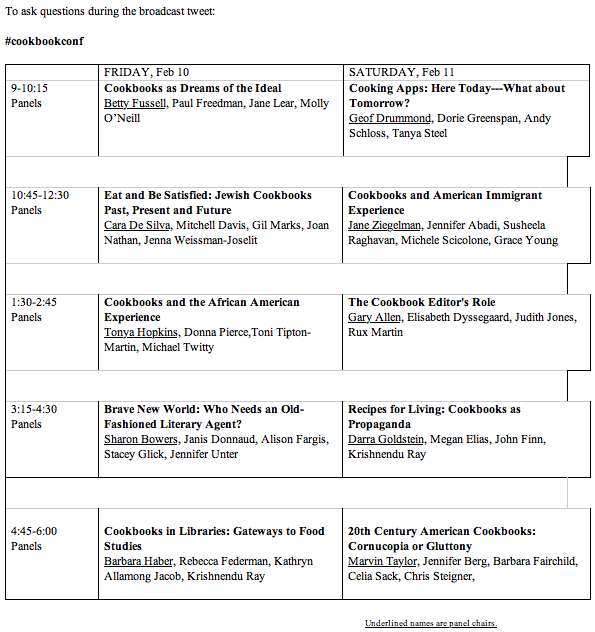 Unfortunately, this year’s Cookbook Conference is completely sold out, and there’s a long waiting list. To make the content available to those unable to attend, ten panels on Friday and Saturday, February 10-11, 9 am-6 pm, will be webcast live. [See the schedule for these ten panels below.] Anyone can tune in, watch the panels, and tweet questions.