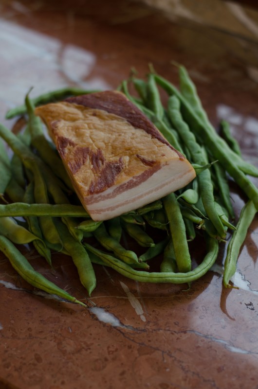 We finally ate them, cooked just like my mother used to cook them, like my grandmothers cooked them. Topped and tailed, with slivers of hickory-smoked bacon, the pink jewel-like against the green of the beans.
