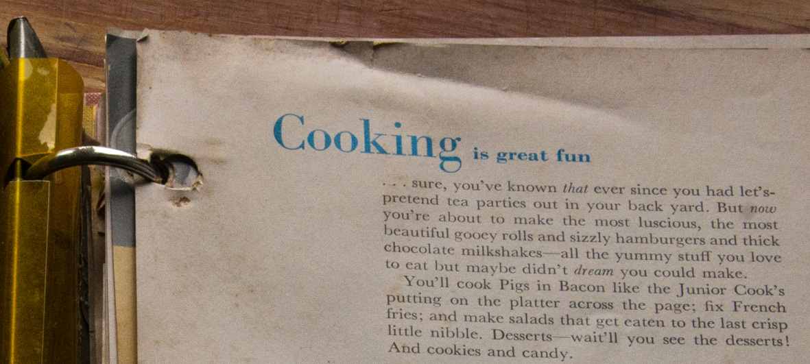 I learned to cook from my grandmother and my mother so I have no cookbooks when I was young. I did inherit my mom’s American’s Woman’s Cookbook that she was given as a wedding present in 1947. It had such great sections as Victory Gardening and cooking for the war. I remember lots of things she cooked from that book including the incredible burnt sugar icing she used to put on spice cakes. I still use it for those recipes that I need once in awhile (stewed tomatoes). I would have loved the Junior cook book.