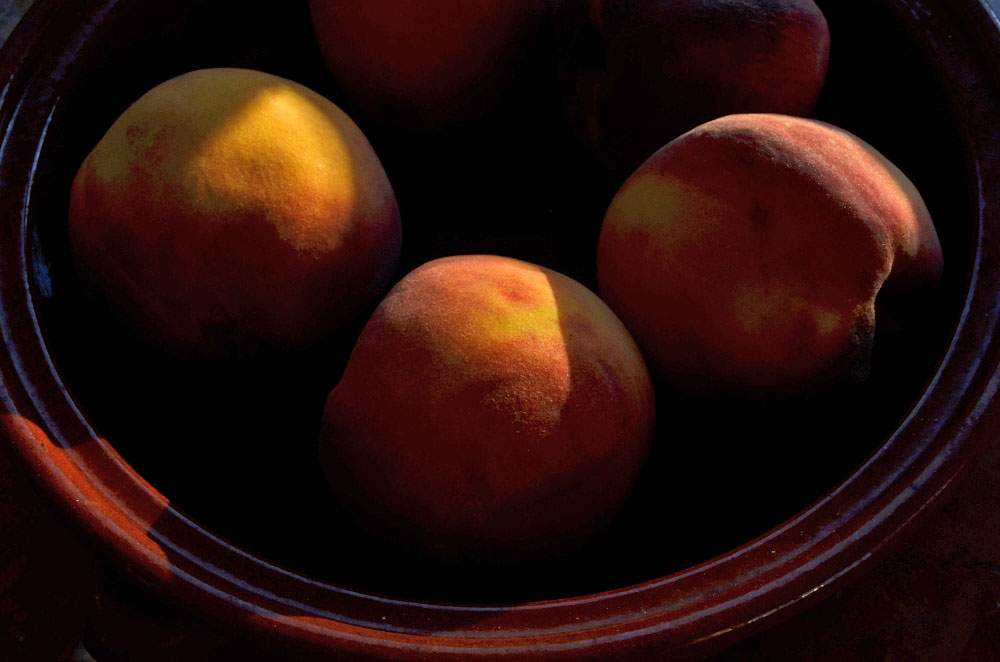 As I cut away the rough, furry peach skins, I discovered brown mottled flesh in places. I salvaged what I could and purée some of the flesh in the food processor, along with a few tablespoons of water. The transformation from solid to liquid, from one form of being to another, always amazes me. I cooked the purée until it thickened, bubbling and spitting. Because the peaches tasted somewhat bland, I added a few teaspoons of peach schnapps to the thick purée and to the fresh peaches.