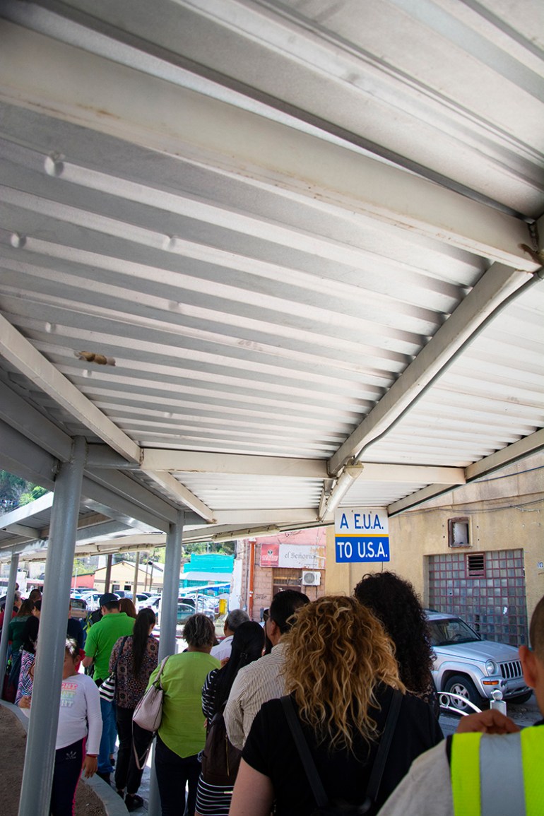 The line for crossing the border surprises me. One line. A hundred people. With more moving to the back by the minute. All patiently standing under a metal awning that must feel like a broiler in summer sunshine. A man strums a guitar and serenades us with Spanish songs as we wait. The young man behind me says it’s always been this way, just one line. A minimum of an hour’s waiting. Standing. I moved forward about two feet every 20 minutes. Or so it seemed. My leg muscles twitch and cramp, a burning sensation running through my calves. A family surges to the front of the line, out of nowhere. A tout jumps back, pockets some money, and tries to leave. But an older woman, her white hair shimmering in the sunlight, accosts him, giving him a tongue lashing for doing that.