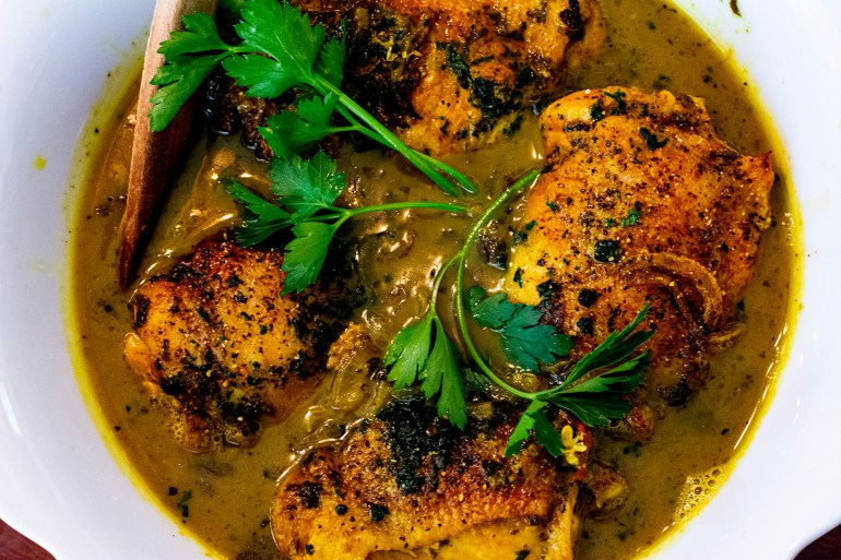 I dried the chicken pieces and salted/peppered them, while the bacon grease heated up in a heavy cast-iron skillet. Once the chicken pieces browned on both sides over medium-high heat, I took them out of the skillet and tossed in the onions. When the onions turned slightly golden and browned at the edges, I added the stock, using less than the recipe called for because 3 pints is 6 cups, which is fine if you wish to make soup, but I was of the same mind as Ms. Gay (see below) and wanted more of a gravy texture to the liquid. In went the lemon juice, recalling the medieval touch of acid to sauces, the turmeric, and finally, the black pepper, 1 teaspoon, which gives the sauce a bit of bite! I returned the chicken to the sauce and covered the skillet, turning the heat to low, simmering the dish for about 30 more minutes. When the chicken was done, tender to the bone, I took it out of the skillet and placed it on deep platter. The sauce seemed a bit thin, thanks to the juices from the chicken, so I cooked it down over high heat until the sauce coated the spoon like a coating of honey. Pouring the sauce over the chicken on the platter, and before serving the chicken, I sprinkled a bit of parsley over the chicken pieces.