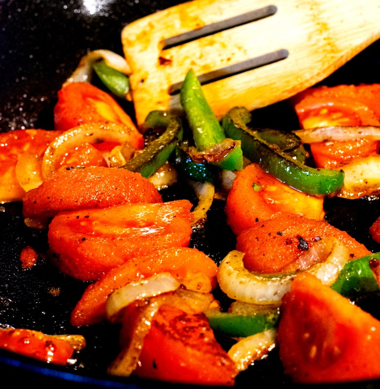 To peel the tomatoes, heat a large pot of water to boiling, cut a small “X” on the end of each tomato (not the stem end). Drop the tomatoes into the boiling water and let cook until the edges of the cut around the “X” begin pulling away from each other, about 2 minutes. Remove from the water and peel. Cut into wedges and set aside. Heat the butter in a large cast-iron skillet, or other heavy-bottom skillet. Toss in the peppers and onions and cook until charred around the edges. Then add the tomatoes, cook until slightly charred. Season with salt and pepper and remove from heat. serve immediately. (You could use a few strips of hot peppers if so desired.)
