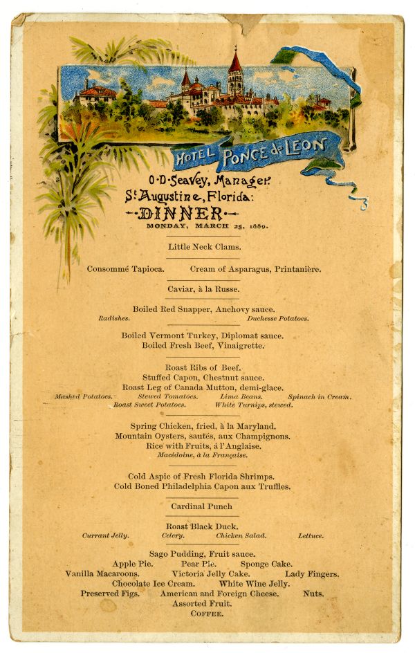 Of the hotels that Flagler built, the Hotel Ponce de Leon of 1888, still stands in St. Augustine, although it is now Flagler College and not a hotel. The menu here illustrates what was on offer on March 25, 1889.