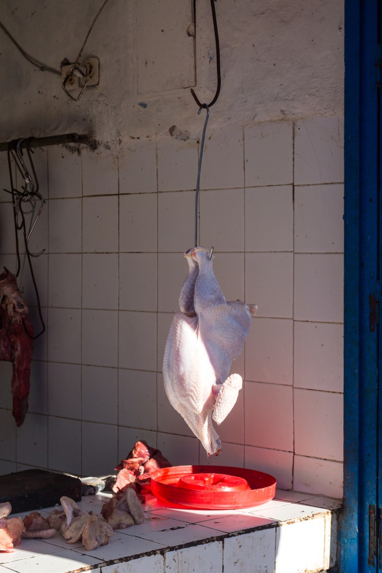 On the other hand, the open-air market in Salé offered the best choices for chicken. Plump chickens, their white feathers sparkling clean in the morning light, clucked contentedly in their little pens. All one had to do was point, and the vendor would grab the victim by the neck, dispatching the creature into the darkness with a sharp knife. Although Jane and Cynthia swore by the flavor of freshly slaughtered chicken, I – wimp that I am – could not bring myself to point. So a few stalls away, vendors sold chicken ready to cook, and that’s where I bought my chickens.
