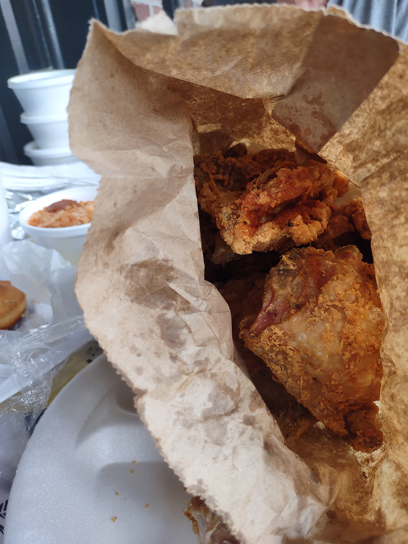 Packed in paper bags, the crispy chicken tastes greasy and salty. Just as it should be. Perfect.