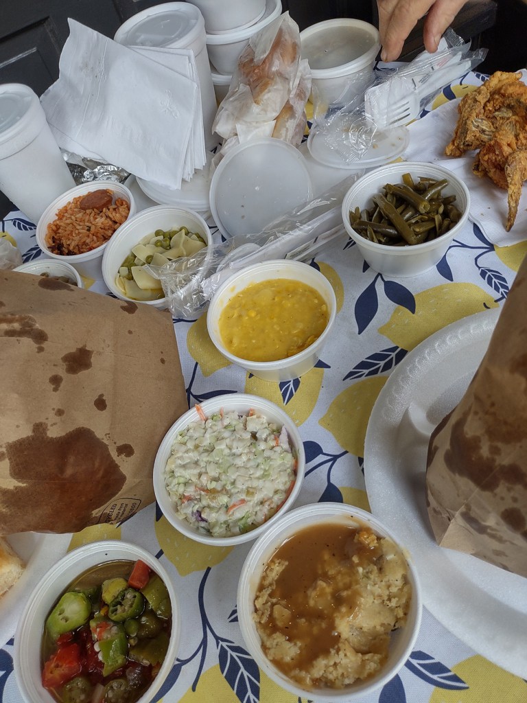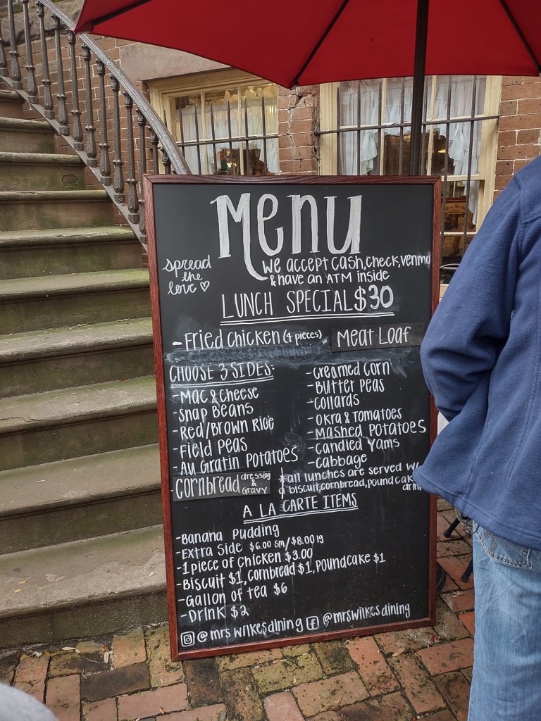 COVID put a dent into the traditional meal format usually associated with Mrs. Wilkes Dining Room. Now, instead of ten strangers sitting at a table, food served family-style in large bowls and overflowing platters, you scramble for seats at tables set out on the street in front of the house. A member of Mrs. Wilkes’s extended family takes your order as you get your turn at the front of the line. Leave your cell phone number and you’ll get a call. Then you wait as long as 45 minutes for that call. Step inside the door of the dining room and another member of the Wilkes family hands you a large flat box heaped high with a lot more food than you know what do with. Cooks now wrap up everything or fill styrofoam containers with the sides.