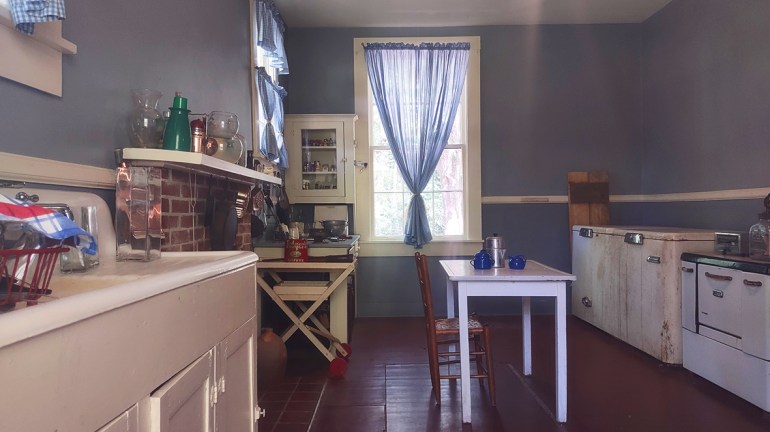 Accessible only by peering through a smudged glass door from the outside, the kitchen epitomized a 1950s kitchen, or even an earlier style.
