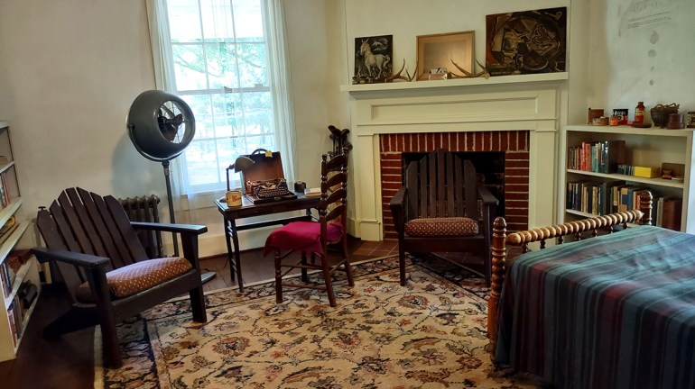 A young docent with a swinging blond ponytail met me on the other side of the door, the handle a bit loose, the white paint flaking. I scrambled around in my wallet for a five-dollar bill and placed it in her slim hand. She smiled, then thrust an odd-shaped, elongated and folded pamphlet at me, delineating a detailed self-guided tour of the house, grounds, and outbuildings of Rowan Oak.