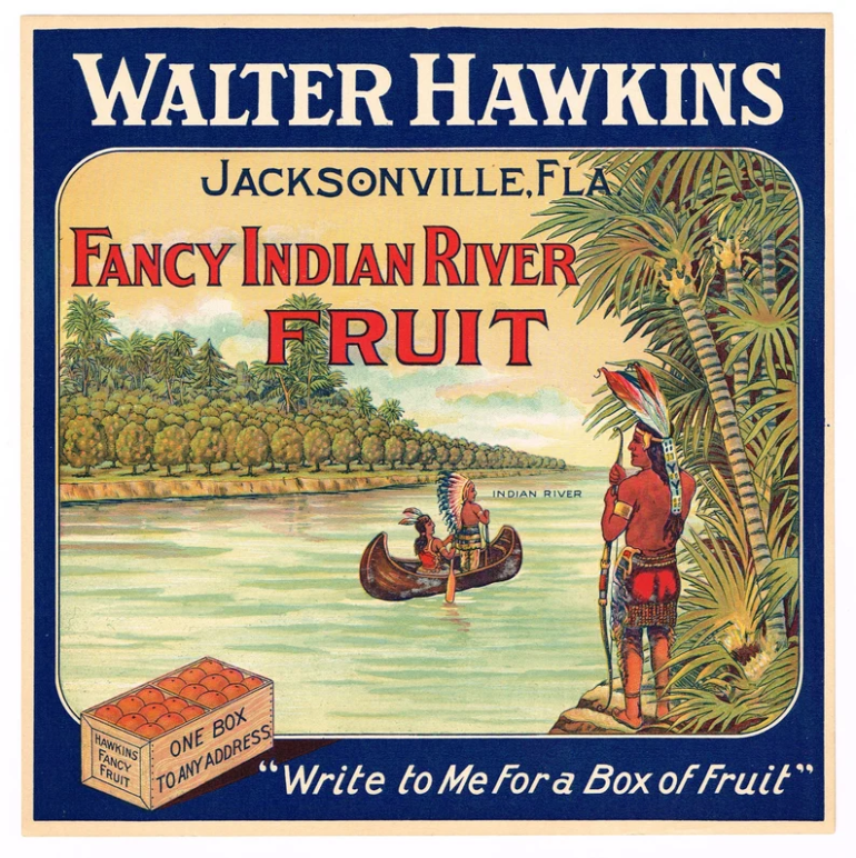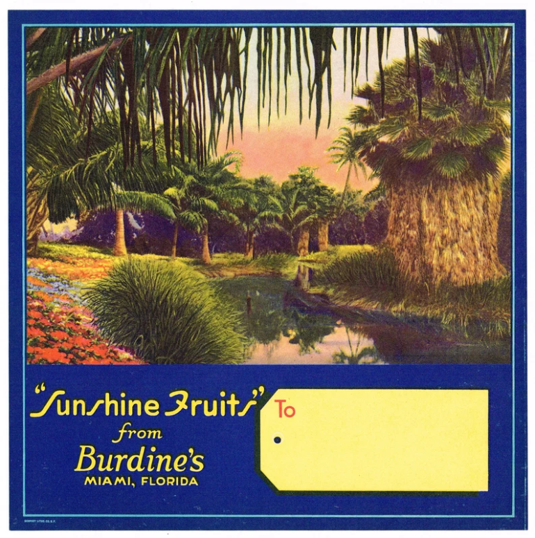 Fast forward to 1885, as Calfornia began shipping oranges across the Great Plains to the East coast of the United States, thanks to the transcontinental railroad and an eager market of buyers. The plain wooden shipping crates, slatted to keep air circulating through the boxed fruit, looked plain and uninteresting. Growers in California organized and set rules for crate label size and content. But when it came to art, diversity and imagination ruled. Florida growers followed suit.