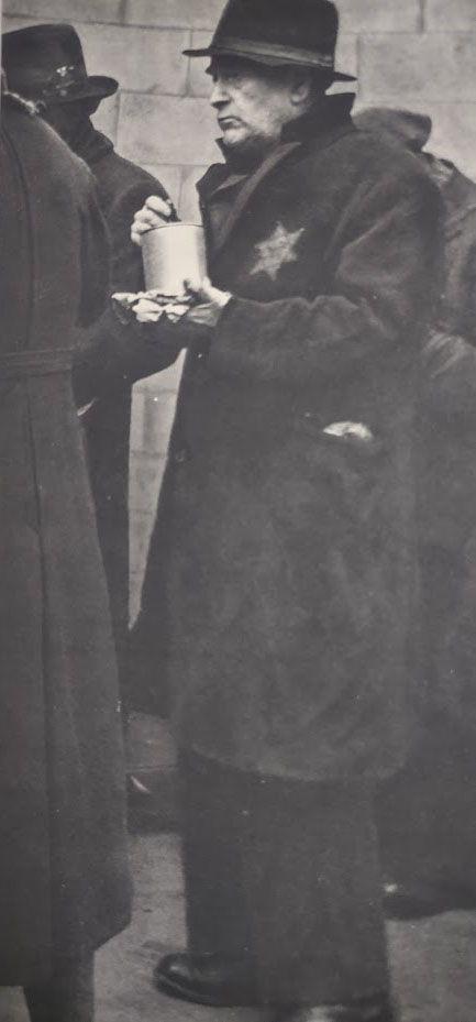 A Jewish man wearing the mandatory yellow star, clutching a cup of soup.