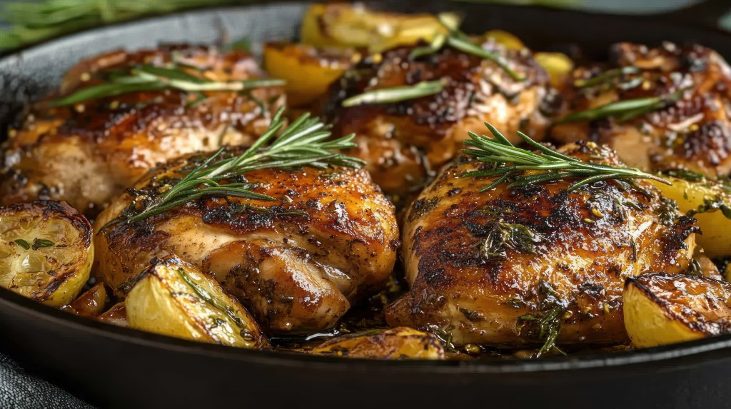 Preheat the oven to 180°C/ 350°F/gas mark 4. Add the rosemary, wine and lemon juice to the pan and bring to the boil. Remove from the heat. Lay the chicken thighs skin-side up on top of the shallots, adding any juices that have come out of the chicken, and cook uncovered for 25 minutes. [Note: 30- 40 minutes is best.] To check that the chicken is cooked through, pierce one of the pieces near the bone – the juice that runs out should be clear, not pink. Taste for seasoning. The chili and anchovies should provide enough, but just make sure. Chop the reserved garlic with the lemon zest and sprinkle over the top. (Recipe adapted from A Bird in the Hand.)